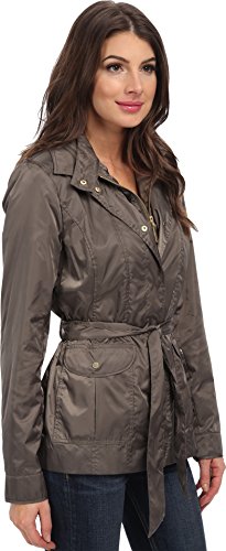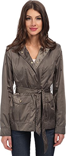 Slimming anorak features a modern cropped hem. Coated polyester fabrication offers light protection from the elements. Detachable, zip-off collar with zip-front closure. Metallic hardware. Belt loop waist with removable tie belt. Stacked side and hand pockets with snap-flap closure. Snap-flap and zipper closure. Shell: 100% polyester with coating;