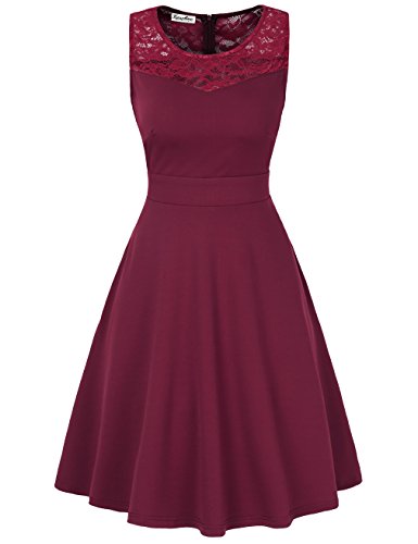 KASCLINO Fit and Flare Dress, Women's Pleated Skater Vintage Floral Lace Sleeveless Wedding Party Dress with Pocket Wine Red M