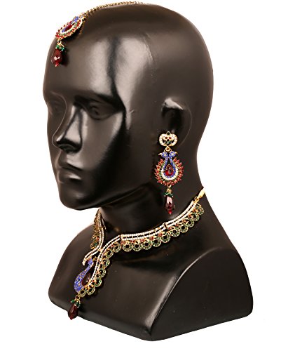 -. Title : Touchstone Indian Bollywood white Rhinestone blue faux sapphire deep red faux ruby and faceted glass drops ethnic peacock motif bridal designer jewelry necklace set for women in antique gold tone