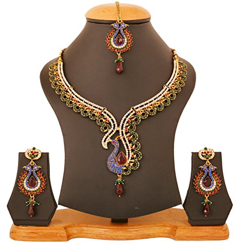 -. Feature : BRAND : Touchstone has been manufacturing exquisite Costume Jewelry for 20 years, inspired by heritage designs. / OCCASION Will add luster when worn for a wedding, engagement, party, prom and any special occasion. Will enhance special days like Christmas, Birthdays, Anniversaries, Valentine's Day, and Mother's Day. A Beautiful & Memorable Gift for all occasions. / SPECIFICATIONS : V shape necklace. Necklace circumference 8 inches with adjustable/flexible soft tasset. Earring weight (single) 12 gms. Earring length 3 inches up to the hung drop. Earring widht 1 inch. "This is in a special dark gold plating to recreate the look of antique jewellery". / MATERIAL & TECHNIQUE : Stainless steel Ear Posts. Special Long lasting Plating with Lacquer finish. Recreates Studded Diamond Jewelry. Hand Finished. Peacock Motif with the National Bird of India. Made of Long lasting Alloy Metal and good quality Rhinestones. Embellished with Faux ruby and Faux Blue Sapphire / 100% RISK FREE PURCHASE; Money Back if not delighted; Enjoy Long lasting plating, handcrafted finish and attention to detail.