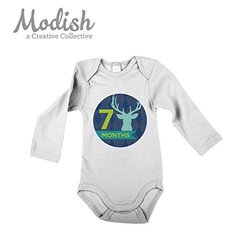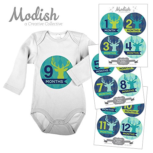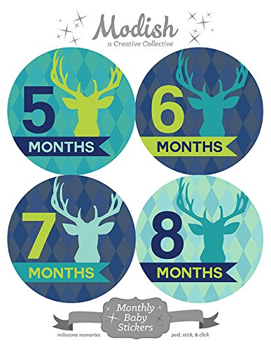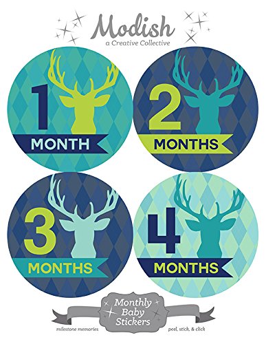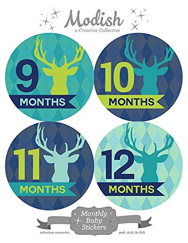 12 Monthly Baby Stickers, Deer, Antlers, Boy, Baby Belly Stickers, Monthly Onesie Stickers, First Year Stickers Months 1-12, Argyle, Teal, Lime,...