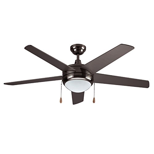 Add modern appeal to your home with this contemporary five-blade indoor ceiling fan, 3-speed reversible motor high/med/low, on/off pull chain controlled, 4" down rod