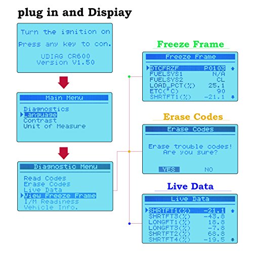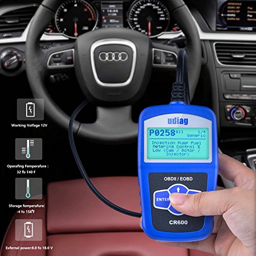 - NO BATTERY NEEDED: Udiag CR600 OBD2 scanner is well built with a large LCD display (128 x 64 pixel) that has white backlight and contrast adjustment, indicates test results directly. Built-in OBD2 DTC lookup library. No batteries needed-powered via detachable OBDII cable.