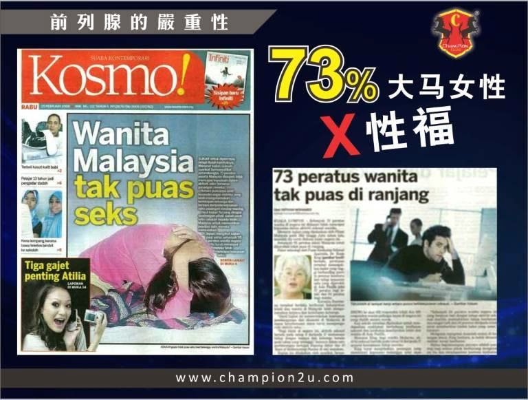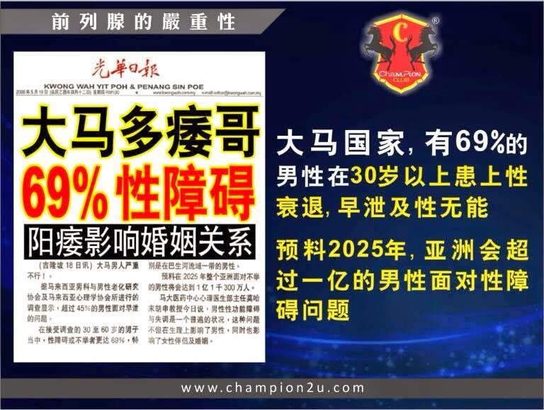 根据世界卫生组织 (WHO) 调查显示,全球超过1亿5千299万名的男性患上前列腺问题而导致勃起功能障碍。根据马来西亚卫生部报告显示,69%大马男士在30岁以上皆面对性衰退、早泄和勃起功能问题,此问题越来越年轻化。