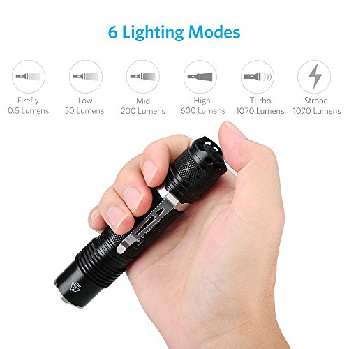 - 5 Modes with Memory: Firefly(0.5LM)/Low(50LM)/Mid(200LM)/High(600LM)/Turbo(1070LM), Double tap tail switch to activate strobe mode, perfect for camping, hiking, cycling, emergency and power outage