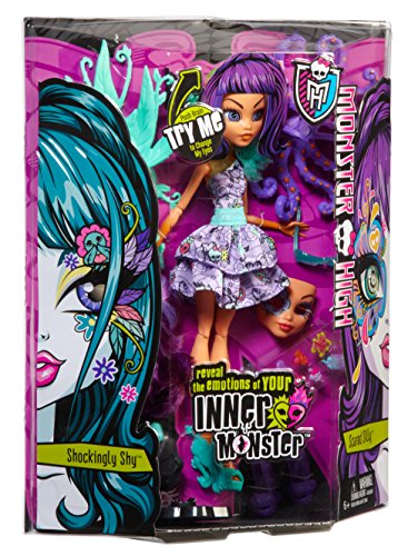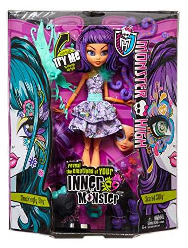 -. Binding : Toy -. Brand : Monster High -. EAN : 0746775361808 -. Feature : Monsters have feelings too! / Customize the emotions of these creepy cool creatures and show it in their eyes / Simply press on their brains to switch between three different expressions / Get even more touchy-feely by modifying their monster parts, snapping in different emoticons / Includes one full doll with the eye-changing/brain feature, face plate, skeleton and chest plate, accessories and more -. IsAdultProduct : 0 -. Label : Mattel -. LegalDisclaimer : 10% RESTOCKING FEE -. Manufacturer : Mattel -. Model : BJR26 -. MPN : BJR26 -. NumberOfItems : 1 -. PackageQuantity : 1 -. PartNumber : BJR26 -. ProductGroup : Toy -. ProductTypeName : TOYS_AND_GAMES -. Publisher : Mattel -. Studio : Mattel -. Title : Monster High Inner Monster Scared Silly and Shockingly Shy Doll -. UPC : 746775361808 -. Warranty : No Warranty