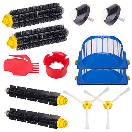 -. Feature : Replacement Roomba vacumm cleaner parts for iRobot Roomba 760 780 790 650 630 Series and Roomba Professional Series Robots. / These roomba vacuum cleaner parts can maintain Roomba's cleaning performance while reducing infiltration of dust, pollen and other allergens into the air you breathe. / How to clean side brush: 1.Use a small screwdriver to remove the screw. 2. Remove the brush, clean the brush and the brush post, and reinstall the brush. / How to clean brush: 1. Remove brush guard by removing both tabs. 2. Remove and clean the brushes. 3. Remove and clean hair and dirt from the yellow brush bearings. 4. Remove and clean the brush caps. 5. Use the included cleaning tool to easily remove hair from the bristle brush by pulling it over the brush. / What do you get: 2pcs Front caster wheels,2pc Flexible Beater Brushes,2pc Bristle Brushes,2pcs Filters, 2pcs 3-Armed Brushes, Ipc Cleaing tool (A&B)