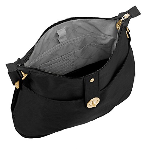 -. Brand : Baggallini -. Color : Black -. Department : womens -. EAN : 0753807167673 -. Feature : BUY WITH CONFIDANCE: Authentic Baggallini Handbags w/Tags. Gift Enclosed - Silver Fever Key Chain 3 in 1- key chain, phone holder and screen cleaner. 1 Year warranty. We handle exchange. / LIGHT AND LARGE Measures: 13" x 4" x 11" w/Adjustable Crossbody Strap. Weight 1 LB / FUNCTIONAL: Lightweight water resistant nylon. Removeable Coin Purse & Outside Pockets. / VERSATILE: Multipurpose Pockets & Compartments. Removeable Coin purse / CLICK "add to cart" to get your BAGGALLINI while supplies last and before the sale P.R.Ice is gone! -. IsAdultProduct : 0 -. Model : HEL694 -. ProductGroup : Shoes -. ProductTypeName : HANDBAG -. Title : Baggallini Helsinki Slim Light Sholder Hobo Bag Crossbody (Black) -. UPC : 753807167673