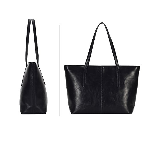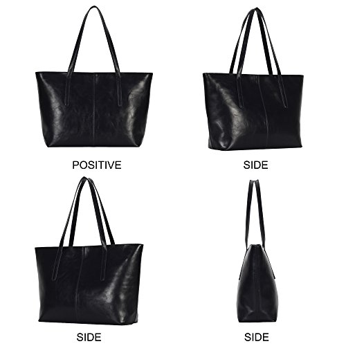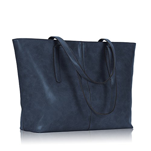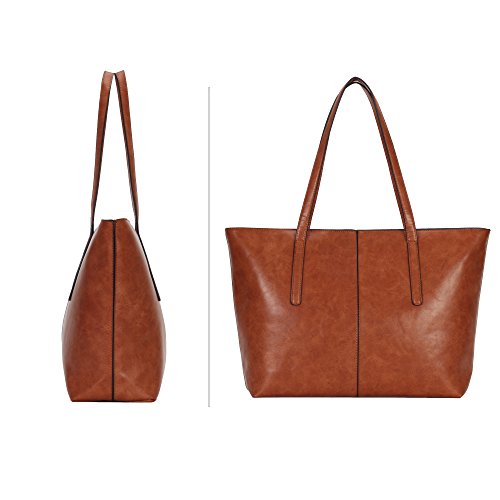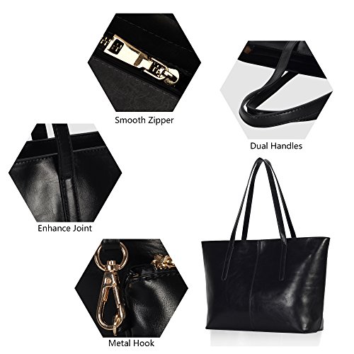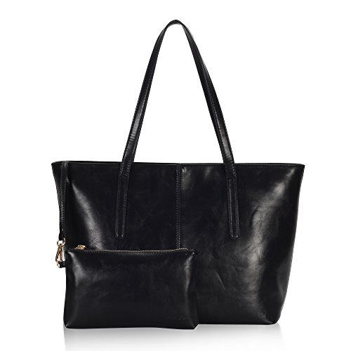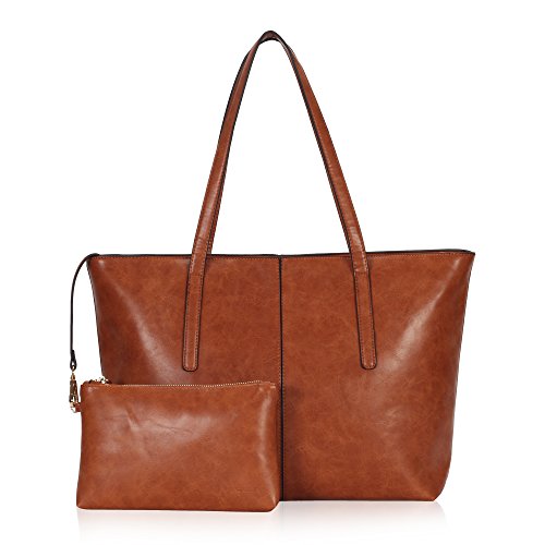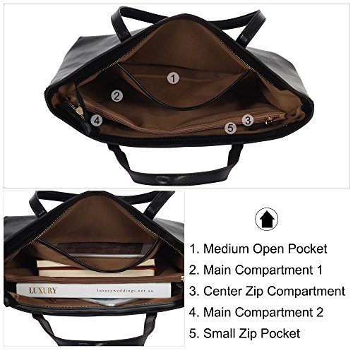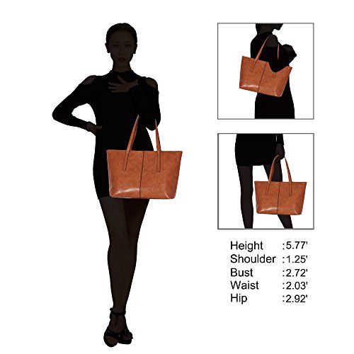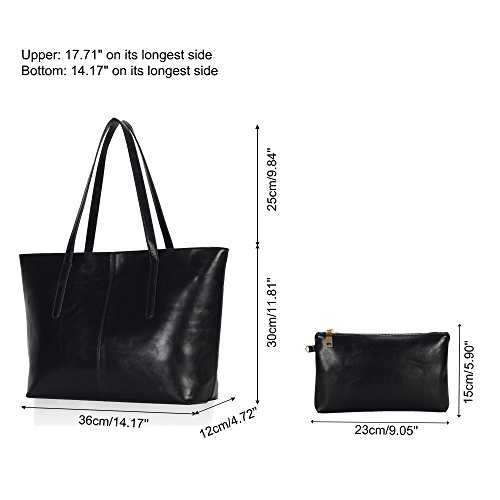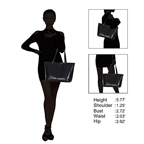 -. Feature : Zipper closure at top for valuables security. Materials: Synthetic leather and polyester lining / Tote handbags for women. Dual top over-the-shoulder carry handles: 9.84 drop inches / Dimensions: Large tote purse: 17.71 (upside) - 14.17 (bottom) L x 11.81H x 4.72W inches. Pouch purse: 9.05L x 5.90H inches. Weight: 1.65 pounds / Internal Structure: 2 interior main compartments separated by 1 center zip divider, 1 middle open pocket, 1 small zipper pocket, which keep stuff inside been well organized; 1 small clutch pouch with key hook / Simple fashion look and powerful capacity for everyday use. Excellent bag for using in office, school, travel or any other daily occasions. Large capacity tote perfectly hold all your lovely necessities: purse, piles of paper, lunch box, cosmetics bag, book, or even diaper for mommy bag. Perfect gift choice