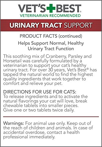 -. Feature : CLASSIC CHICKEN FLAVOR - Finicky cats rejoice: as of March 1, 2017, we have switched back to our classic chicken flavor. Once again your feline friend can get the relief they need with the taste they love. / SAFE AND NATURAL - Vet's Best Feline Urinary Tract Support provides a safe and natural way to bolster your cat's normal, healthy urinary tract function. / VETERINARIAN FORMULATED - A balance of natural ingredients, including cranberry, parsley, and horsetail, has been formulated by a veterinarian to support your cat's healthy urinary tract. / APPROVED - Each bottle carries the National Animal Supplement Council (NASC) Seal of Approval. / EASY DOSAGE - For best results, break one or two tablets daily into smaller pieces to release ingredients and the natural flavor your cat will love.