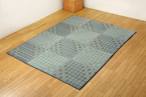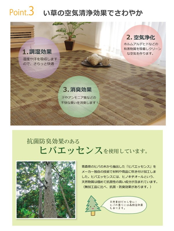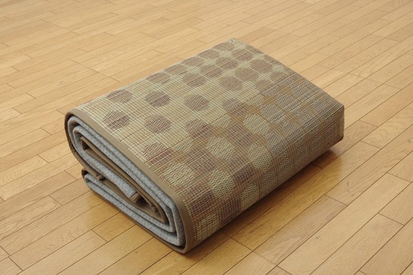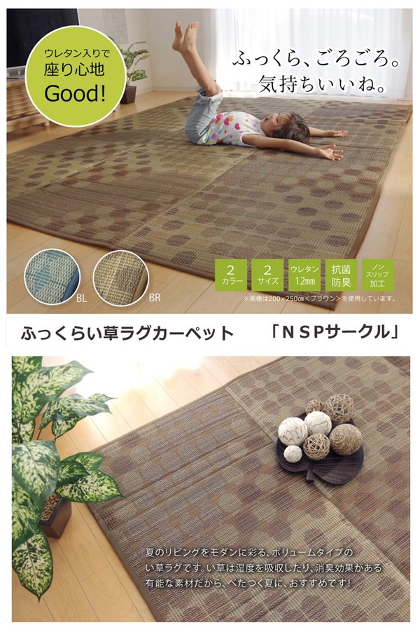 小さなサークルを沢山ちりばめたデザインのい草ラグです。クッション性にこだわり、中材にはウレタンフォームを12mm使用しました。底付き感なく、ふっくらとした踏み心地の商品です。裏面には滑りにくい加工も施しており、フローリングのお部屋には最適です。い草には空気の自然浄化作用、湿度の調節作用などがあります。また汚れにくく、使用するうちに黄金色に変化し、味が出ます。