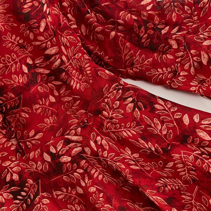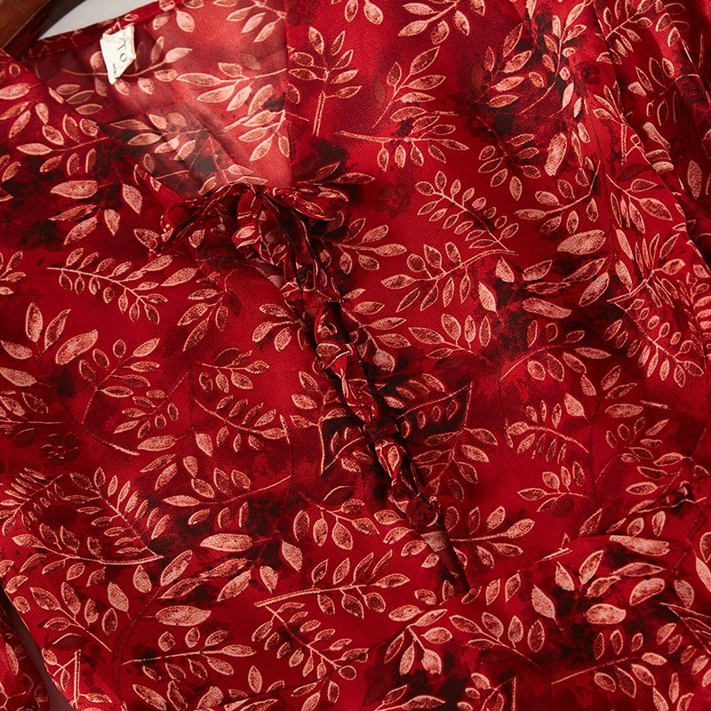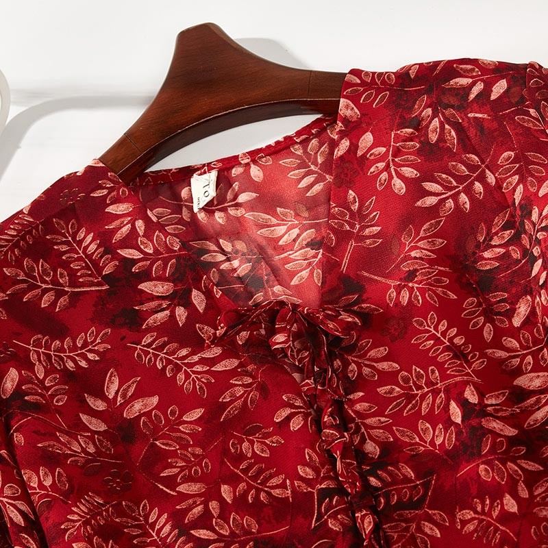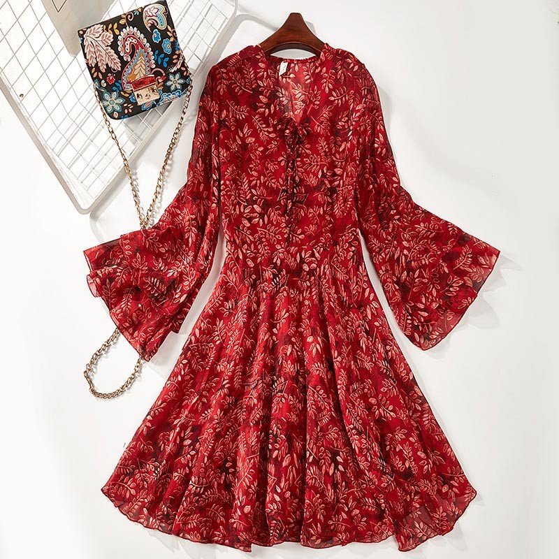 Vネック・ボタニカルプリント・トランペット袖のシフォンワンピース♪