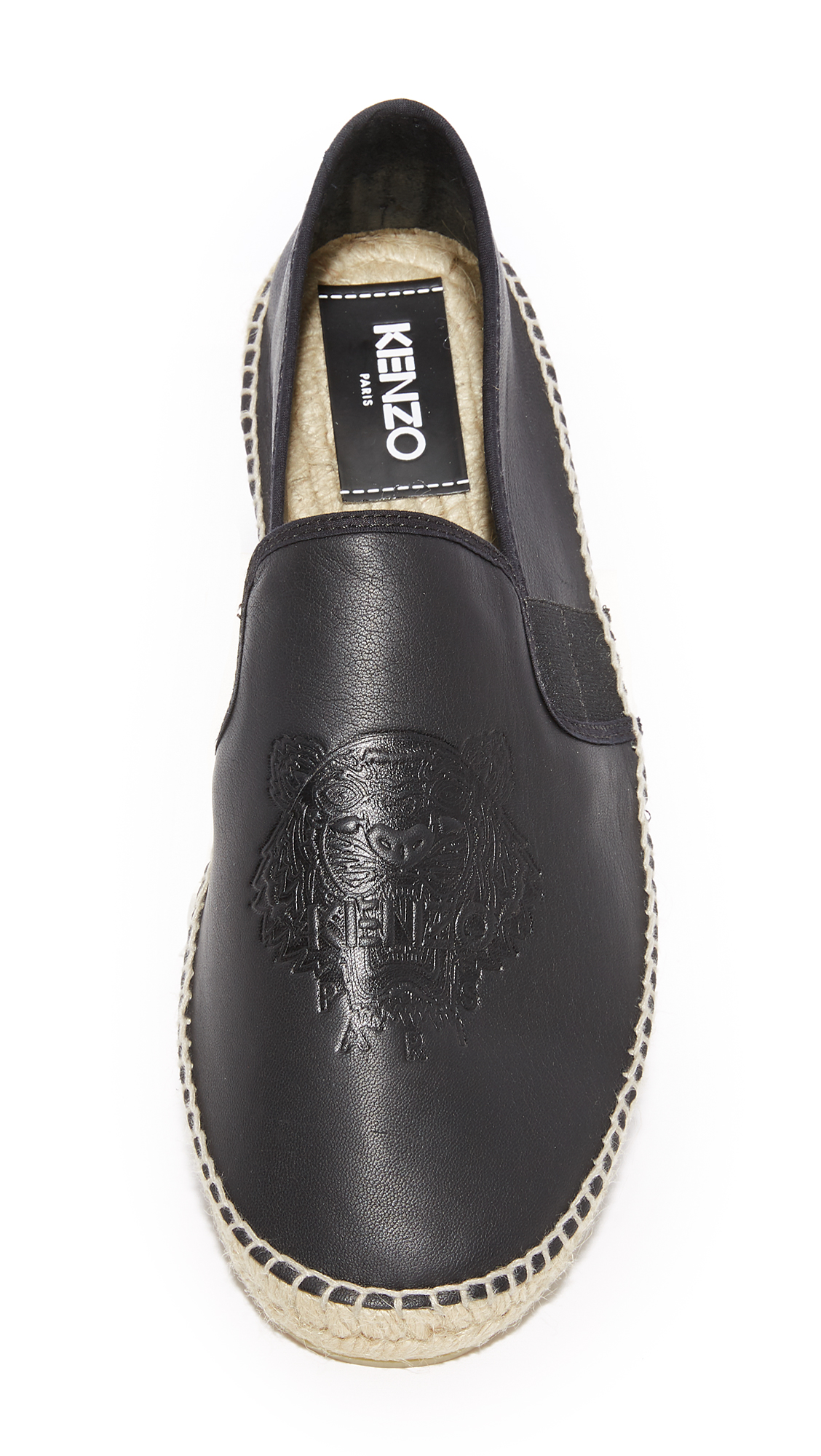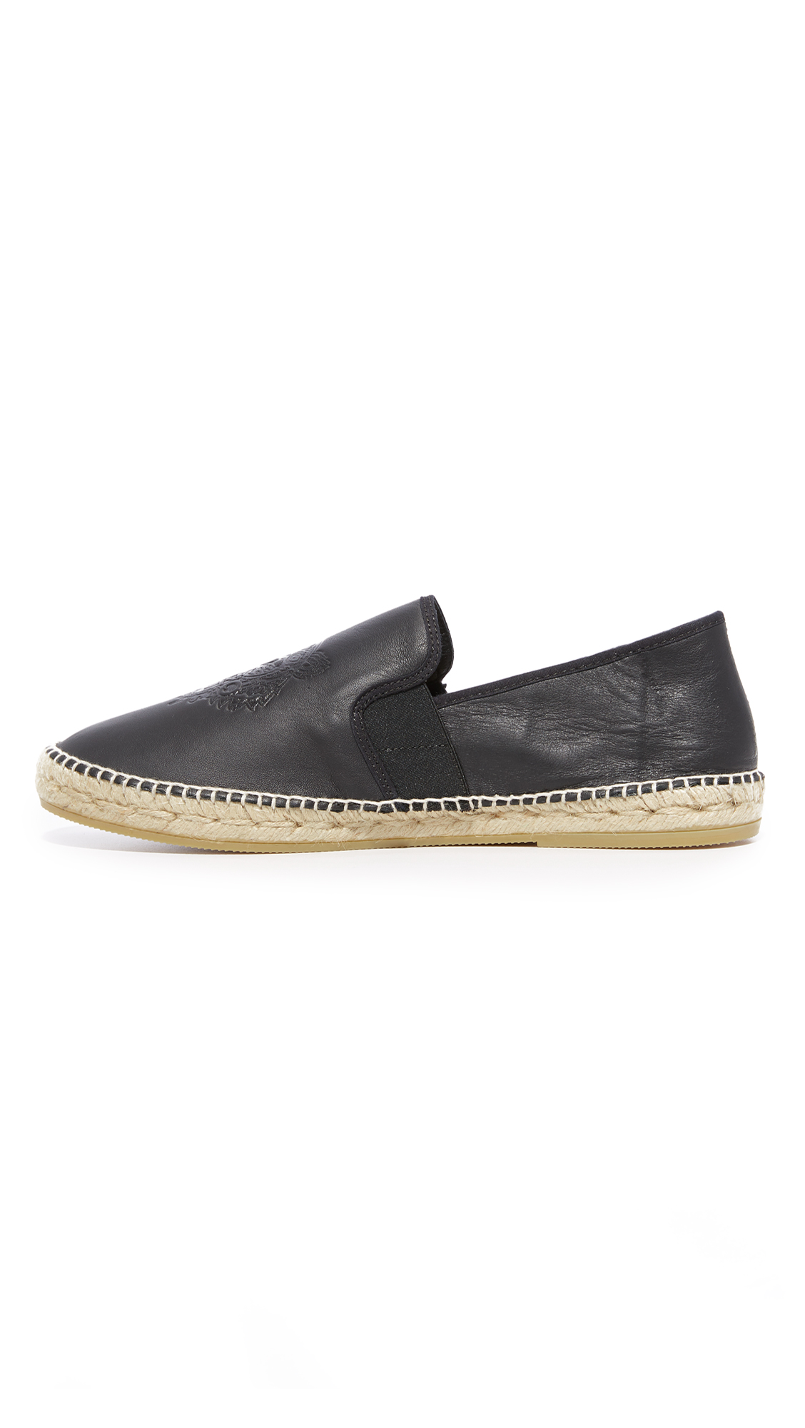 Leather KENZO espadrilles with embossed tonal branding. Elastic straps flank the tongue. Woven jute insole and midsole. Rubber sole.Leather: Calfskin.Made in Spain.This item cannot be gift-boxed.Style #KNZOO30537