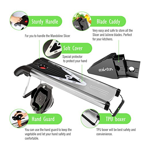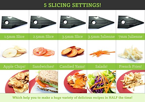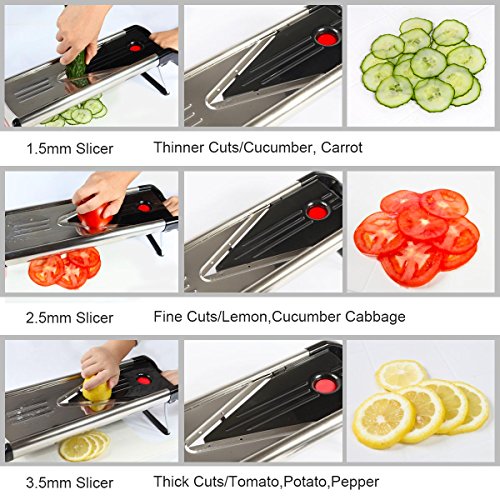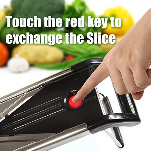 Special protector cover and most versatile slicer: put special protector cover to protect your hand;special 5 slicing inserts give you the flexibility to cut paper-thin potato chips, thick tomato slices for a mouth-watering blt, and even shred cabbage for coleslaw on the side.