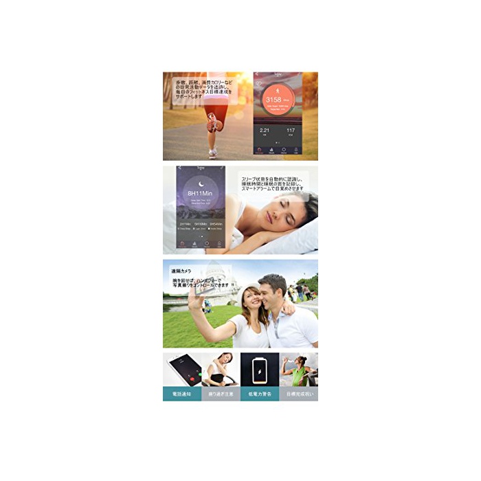 【기능】심박수계측,활동량 계측,보수계-페도미터,시계,날짜,주행 거리,칼로리 소비.Bluetooth 4.0접속 wireless 데이터 동기에,수면검측,,휴대 분실 방지,원격 카메라,스마트 알람,안정도가 # 주의,전화/Facebook/Twitter/SMS등 착신 통지도 진동으로 알려 드리겠습니다.또한심박수,활동량계(보수/이동 거리/칼로리 소모)고, 수면 상황을 주/월/해마다 그래프화 되어 있습니다. 더욱 좋은 몸의 건강 상황을 파악에 옵니다.