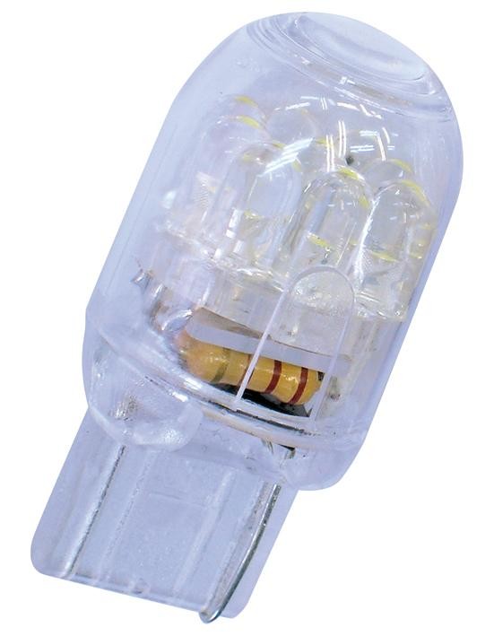 電球トップ部分のレンズ効果でワイドに発光します。高輝度LEDを9個搭載。プラスマイナスを気にせず使用できる極性フリータイプです。 製造国:日本 素材・材質:樹脂 仕様:T20ウェッジ球/シングル 12V発光色:ホワイトLED9個搭載 1個入用途:バックランプ・ストップランプ※お届け地域により、別途運賃がかかる場合やお届けできない場合がございますので、お問い合わせ下さい。