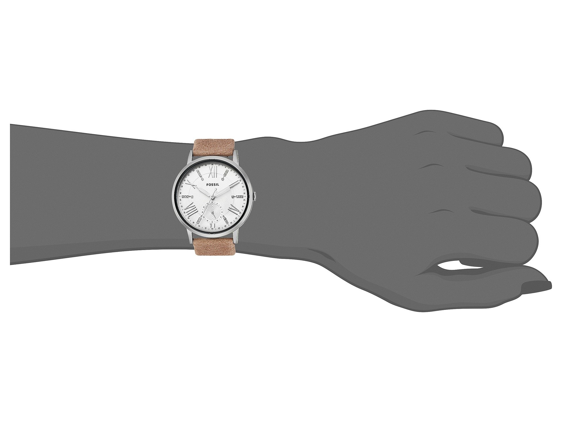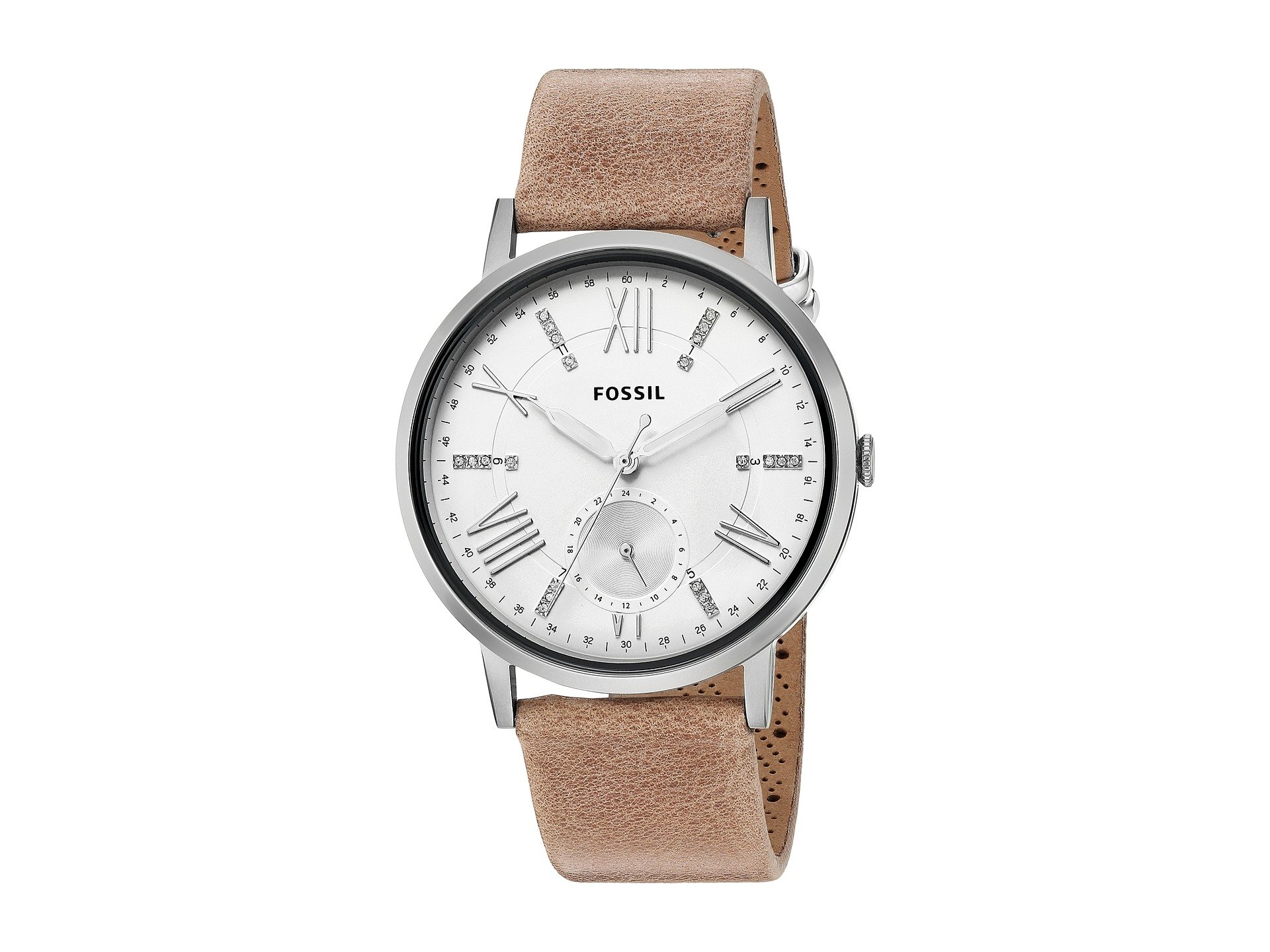 | Product Information SKU: #8887301This dazzling style from Fossil? is sure to keep all eyes on your chic ensemble!Stainless steel case.Leather strap with adjustable buckle closure.Round face.Three-hand analog display with quartz movement.Dial features silver-tone hands and hour markers, crystal detailing, single subdial, minute track, and Fossil detailing.Water resistant 5 ATM.Display case included.Imported.This product may have a manufacturer's warranty. Please visit the manufacturer's website or contact us at warranty@support.zappos.com for full manufacturer warranty details.Measurements: Case Height: 40 mm Case Width: 40 mm Case Depth: 10 mm Band Width: 17 7?9 mm Band Circumference/Length: 8 3?4 in Weight: 2 oz |