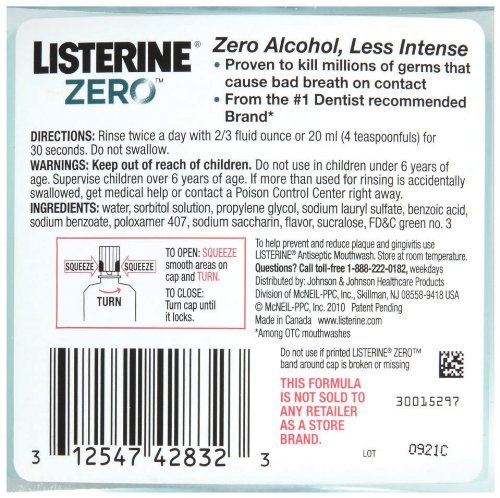 -. Binding : Health and Beauty -. Brand : Listerine -. Feature : Less intense / Zero alcohol / From the #1 dentist recommended brand -. Label : Johnson & Johnson -. Manufacturer : Johnson & Johnson -. MPN : 570048 -. NumberOfItems : 12 -. PackageQuantity : 12 -. PartNumber : 570048 -. ProductGroup : Beauty -. ProductTypeName : BEAUTY -. Publisher : Johnson & Johnson -. ReleaseDate : 2015-05-15 -. Size : 16.91 fl. oz. (Pack of 12) -. Studio : Johnson & Johnson -. Title : Listerine Zero Mouthwash, Clean Mint, 16.91 Fluid Ounce (Pack of 12)