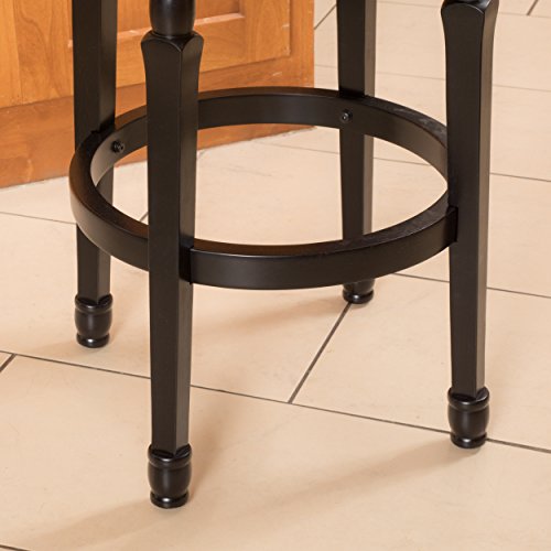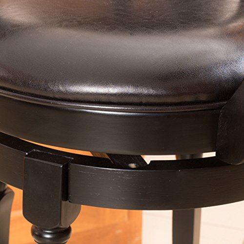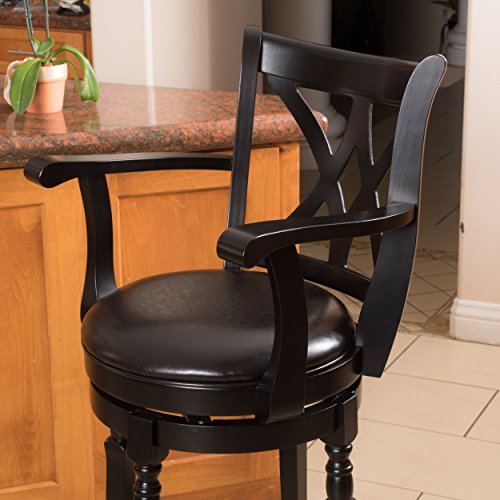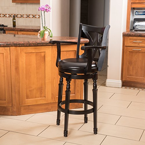 -. Feature : 21"D x 21"W x 45.5"H, Seat: 16"D x 16"W x 30.5"H, Arms height: 37.8," Footrest height: 10" / High density foam seat with black bonded leather upholstery / Solid hardwood legs, frame, and arms in black finish / Convenient 360º swivel seat / With its clean lines and luxuriously carved design, the Montreal Black Finish Swivel Bar Stool captures the feel of upscale furniture, while ensuring versatile function and exceptional durability. Sure to make an impression in any setting, this elegant stool features a seat upholstered in black bonded leather to envelop you in luxurious comfort as you unwind over a drink or enjoy a meal with friends. The 360 degree swivel feature ensures you always have the best seat in the house, while the full-ring footrest offers added comfort and makes getting in and out of the stool a breeze. With its upscale look and practical function, this bar stool is sure to remain a favorite part of your seating arrangement for years to come.