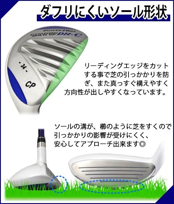 ユーティリティ型ヘッドのチッパーは通常のアイアン型に比べてスイートスポットが広いため、多少のミスヒットでも距離の差が出にくい特徴があります。また、ソールに幅があるのでダフリにくく、アプローチが苦手な方でも安心して振ることが可能です。 |