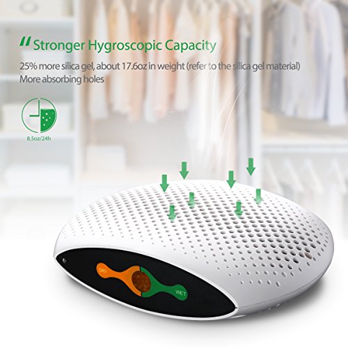 - Stronger Hygroscopic Capacity. Adding more 25% silica gel than others, this compact dehumidifier performs better in dehumidification, about 8.5oz (Compared 4-6oz). They have more moisture absorbing holes which allow the air in the area to contact the beads for upgraded adsorption ability