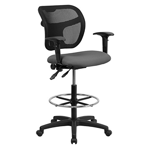 -. Title : MFO Mid-Back Mesh Drafting Stool with Gray Fabric Seat and Arms