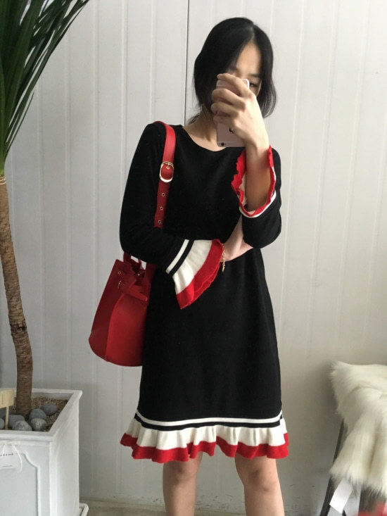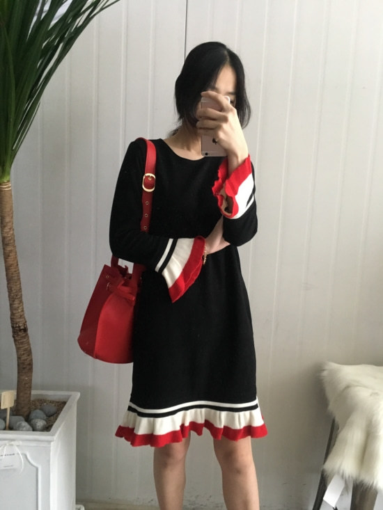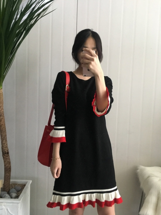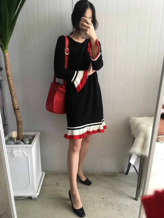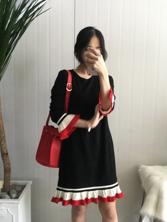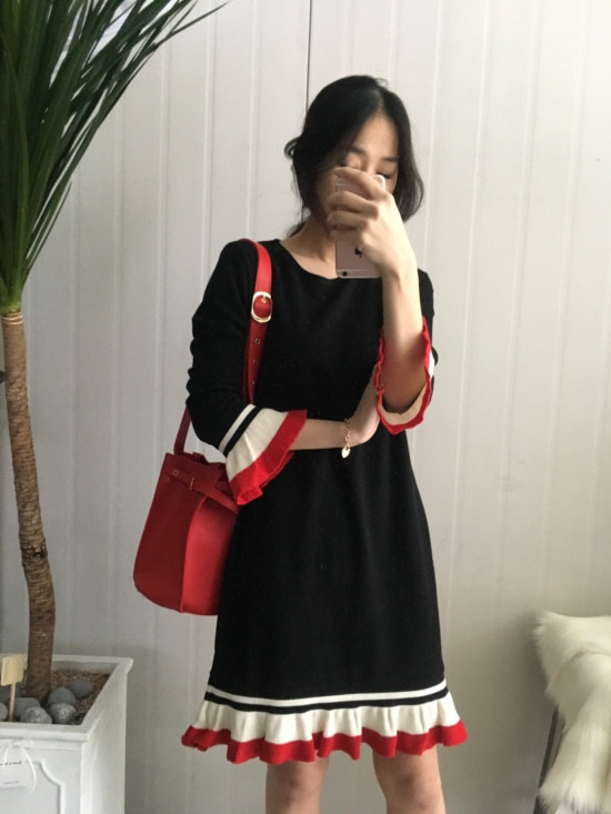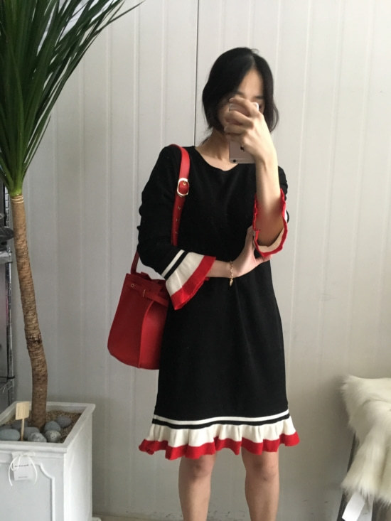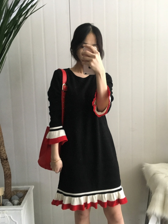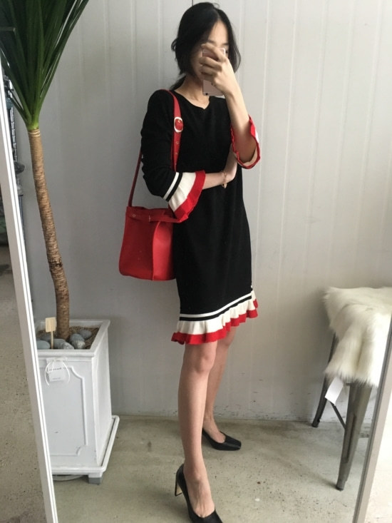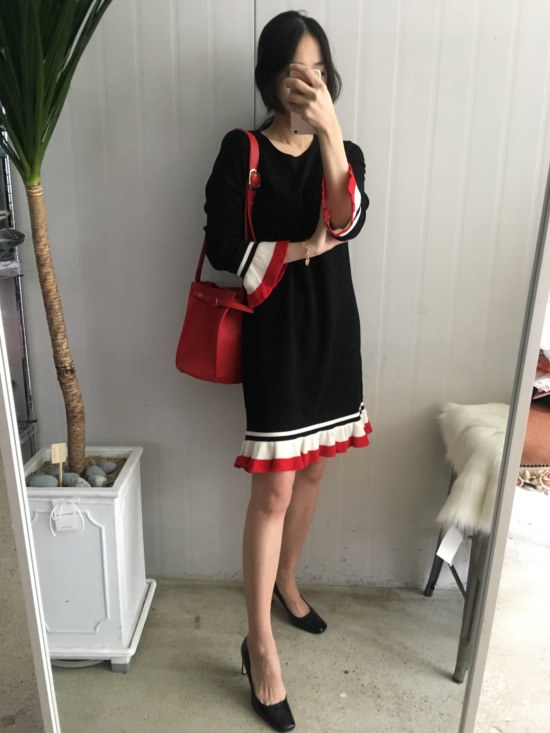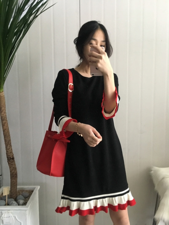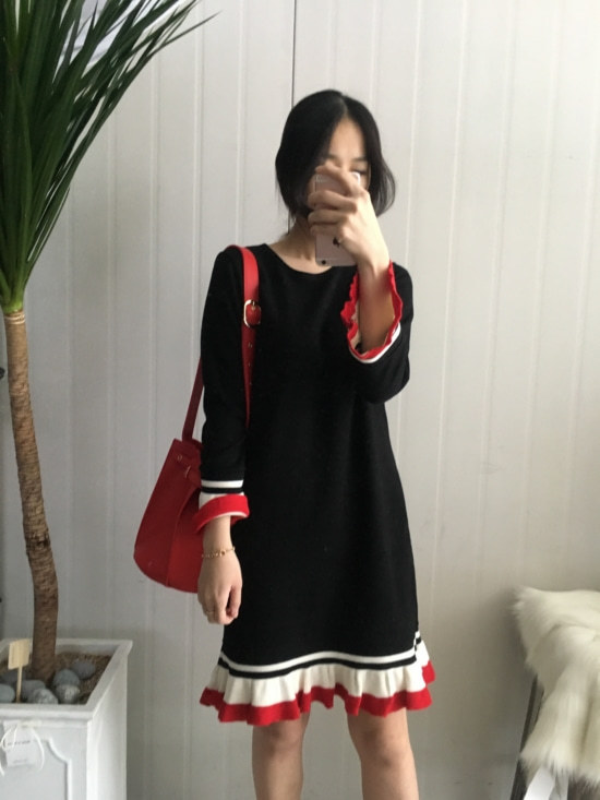 부드러운 니트지원단의 원피스에요 깔끔한 블랙 바탕에 끝단에 배색으로 컬러가 들어가있어서 너무 이쁘구요 주름이 고급스럽게 보인답니다 소매끝단의 프릴로 러블리함이 더해졌구요 캐쥬얼하게도 또는 여성스럽게도 연출가능하세요 스니커즈랑 매치하시면 캐쥬얼한 느낌이 나구요 구두랑 매치하시면 여성스러운느낌이랍니다 쫀쫀한 신축성있는 니트지 원단이라서 착용감이 더 좋으세용
