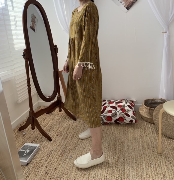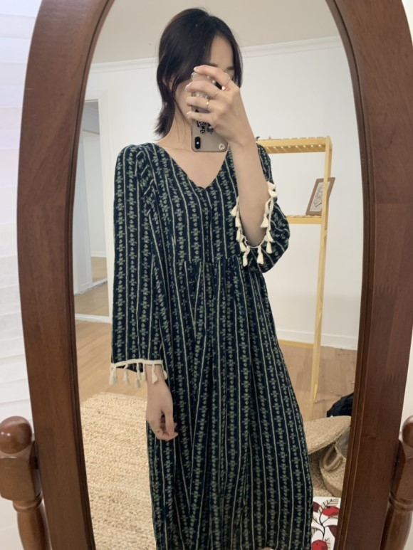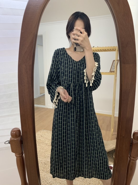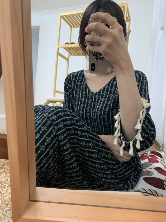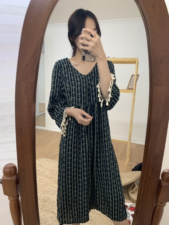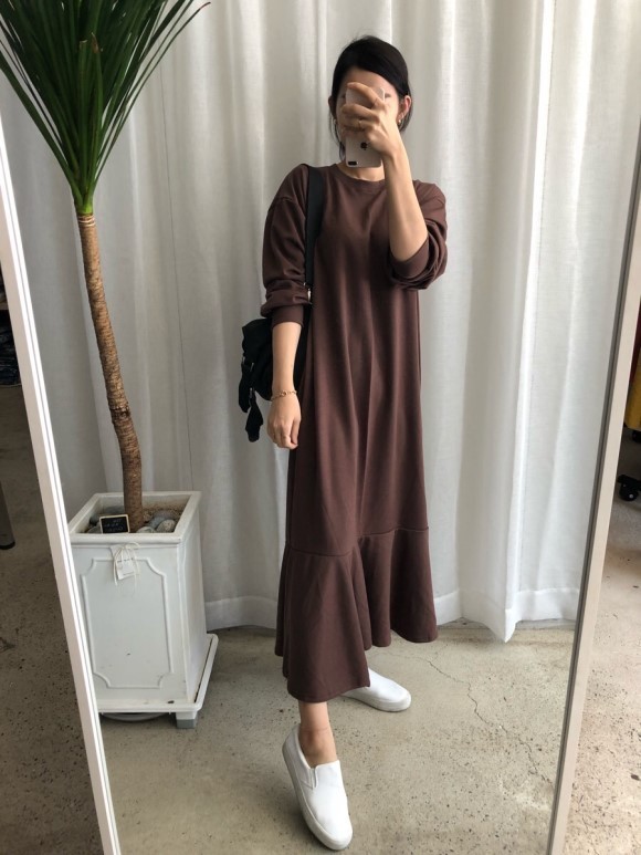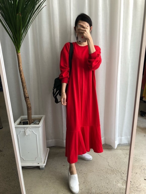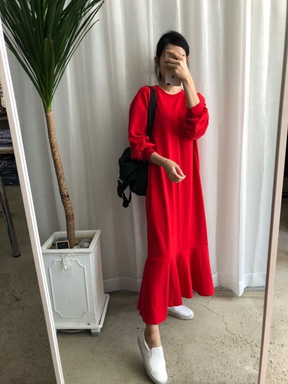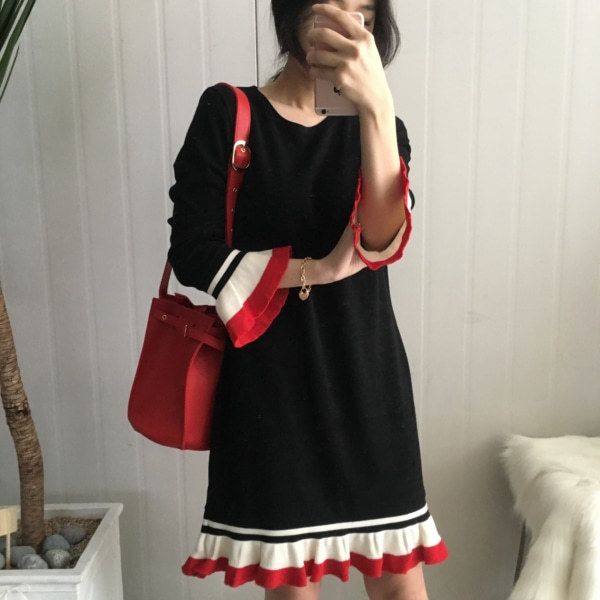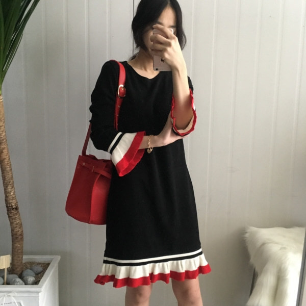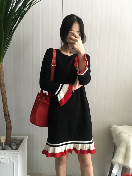 부드러운 니트지원단의 원피스에요 깔끔한 블랙 바탕에 끝단에 배색으로 컬러가 들어가있어서 너무 이쁘구요 주름이 고급스럽게 보인답니다 소매끝단의 프릴로 러블리함이 더해졌구요 캐쥬얼하게도 또는 여성스럽게도 연출가능하세요 스니커즈랑 매치하시면 캐쥬얼한 느낌이 나구요 구두랑 매치하시면 여성스러운느낌이랍니다 쫀쫀한 신축성있는 니트지 원단이라서 착용감이 더 좋으세용