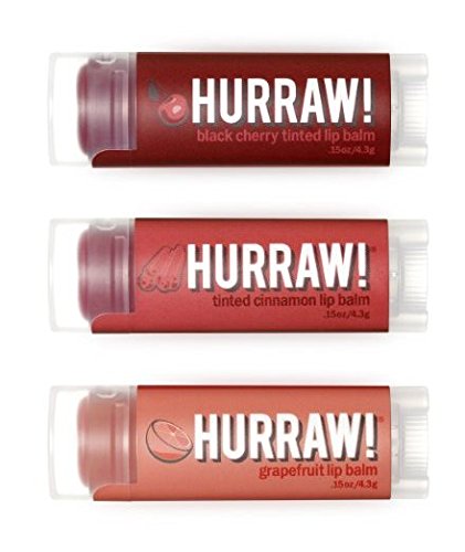 THREE 4.3g/.15oz Oval Tubes - BLACK CHERRY TINTED Balm (provides a deep red sheer tint), TINTED CINNAMON Balm (Hot & Spicy! Sweet with a tingly zip :) This balm will leave your lips with a fabulous sheer red tint), GRAPEFRUIT Balm (Florida grown grapefruit peels makes our creamy grapefruit lip balm out of this world zesty!) Made with Premium Organic, Vegan and Raw Ingredients. Hurraw! Balms are Cruelty Free, GMO Free and Gluten Free. Simply the Best Luxury Lip Balm MADE IN THE USA.