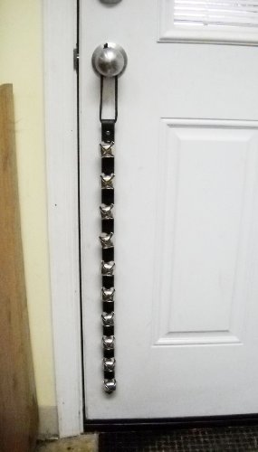 This 28" long by 1" wide handcrafted black leather strap has Ten 1 ½" Nickel Plated Bells. Train your puppy, dog, or cat to bump these bells to let you know they have to go outside. Your pet will learn quickly with a little training. A leather lacing for easy hanging on door knob or anywhere else you would like to hang it. If your pet is scratching at your door and you do not hear it over your TV, these bells are your answer. These are also great decorative bells to have hanging, just for the look, and to let you know someone came through the door. 0