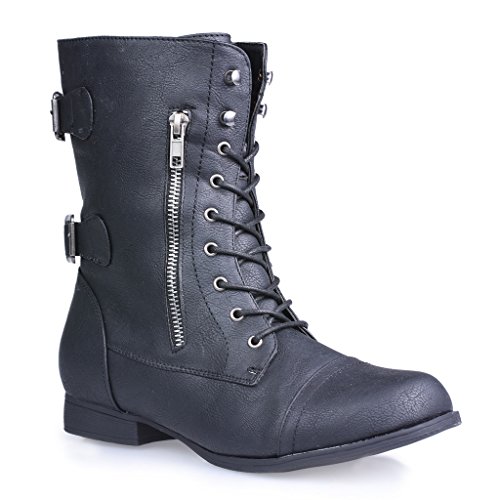 -. Feature : Wide Width/Wide Calf (Finally!!) / Faux Leather Upper / Mid-Calf Boot / Padded Footbed / Chic Military Style