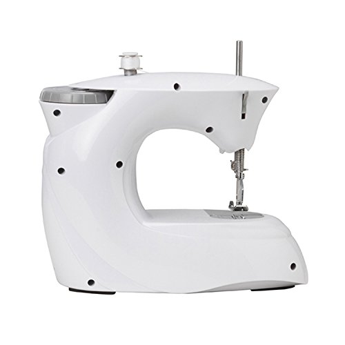 -. Feature : Lightweight and portable sewing machine with three important functions: straight stitching, automatic Bobbin winding, and speed adjuster / With the Bobbin winding function, Bobbin is easily wound in just a few seconds / Extremely lightweight (2.49 lbs) for carrying around, and saves a lot of space / The built-in LED light provides well lit working Area that is especially useful when sewing dark clothes or working at night / Two ways to supply power: using DC 6V 1000Ma adaptor or 4Aabatteries (not included)
