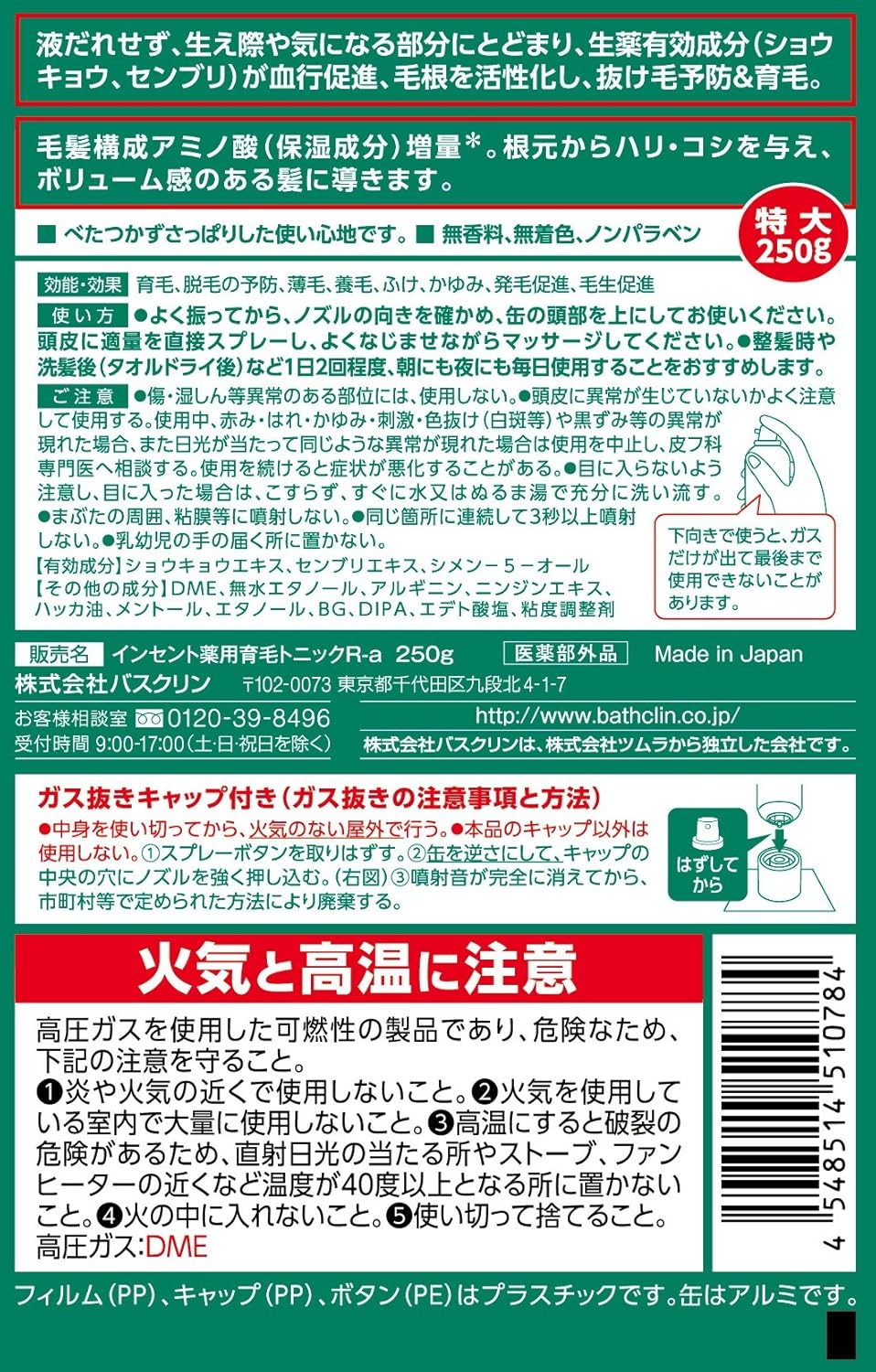 原産国:日本 内容量:500g 全成分:ショウキョウエキス、センブリエキス、シメン-5-オール<その他の成分>DME、無水エタノール、アルギニン、ニンジンエキス、 メントール、ハッカ油、エタノール、BG、DIPA、エデト酸塩、粘度調整剤 髪質:全髪質対応