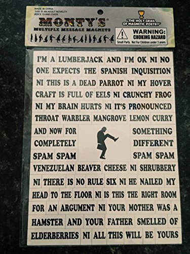 Studio : Nerd Block Publisher : Nerd Block Product Description And now for something completely different! This magnet set features a multitude of renown Monty Python movie words which you can rearrange into hilarious messages. Includes such inspirational words as Ni, Warbler, Mangrove and Spam. This set is the Holy Grail of magnetic poetry! 0