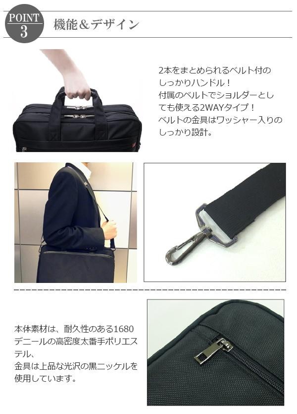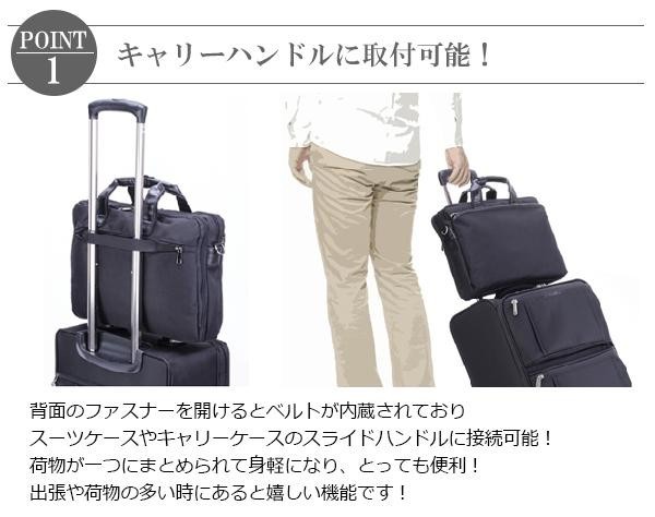 | スーツケースやキャリーバッグのハンドルに取り付けて運べる、ハンドル通し付きのビジネスバッグ。A4サイズの書類を収納できるサイズです。 |