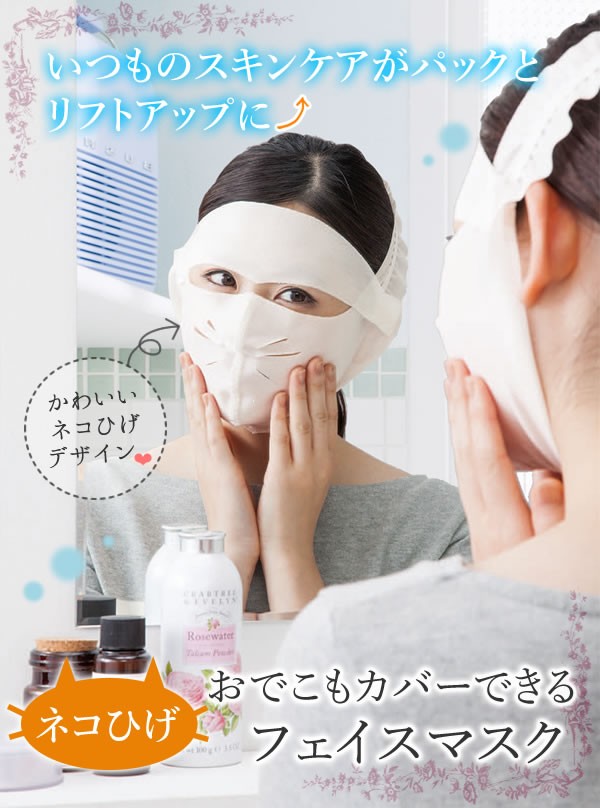 | いつものケア用品なのに肌荒れが…。それは加齢が原因かも。「おでこもカバーできるネコひげフェイスマスク」なら、肌に触れる面が天然繊維の綿とシルクだけ!天然繊維なのに伸縮性があるから、顔にぴったりフィット。パワーラインであごのたるみをグイッ!フィット感が高く、立った姿勢で家事も。マスク中に眼鏡もかけられる。 |