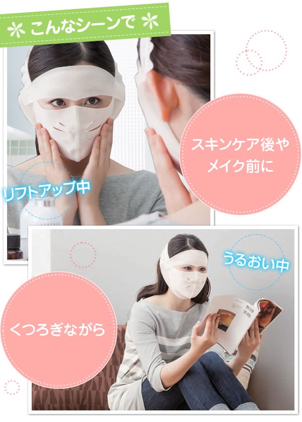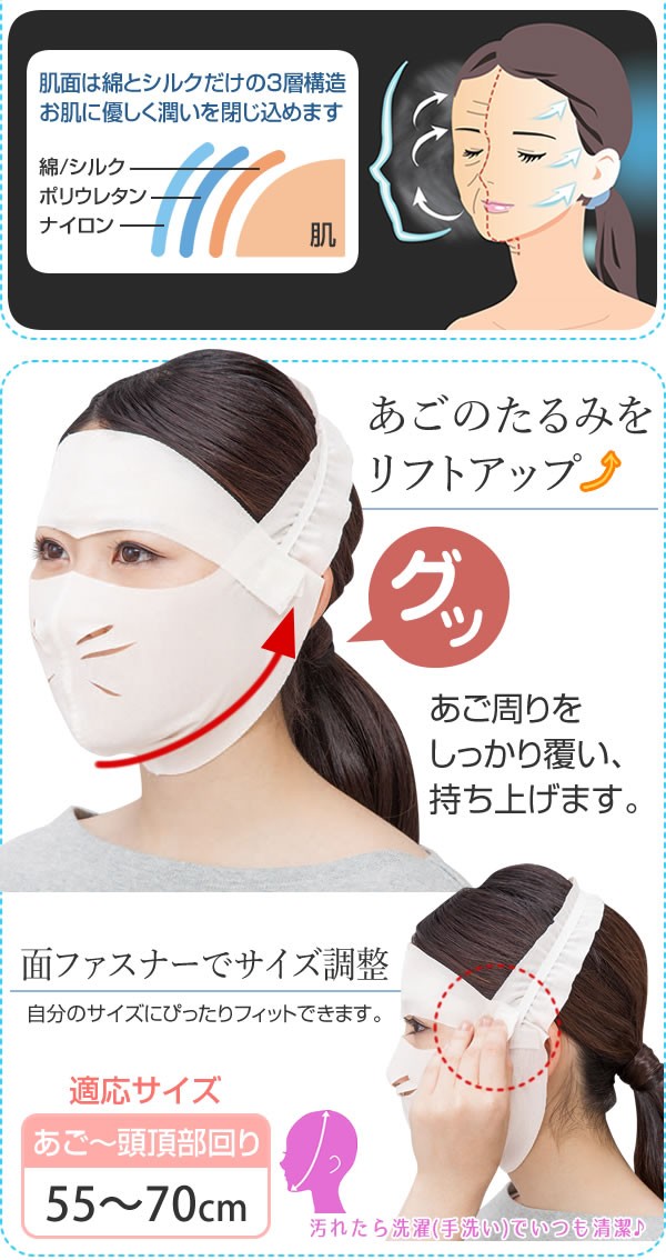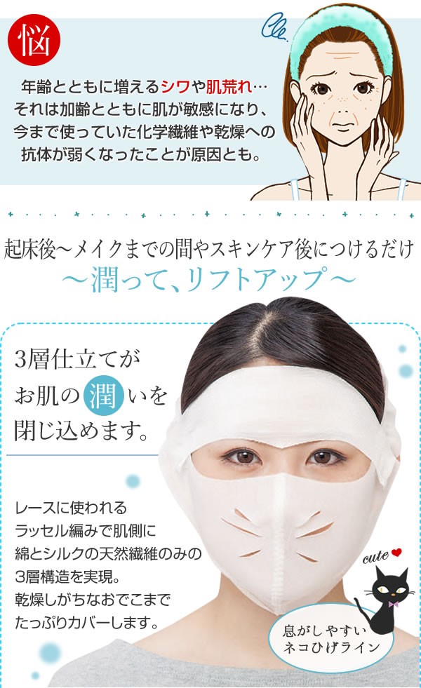 | いつものケア用品なのに肌荒れが…。それは加齢が原因かも。「おでこもカバーできるネコひげフェイスマスク」なら、肌に触れる面が天然繊維の綿とシルクだけ!天然繊維なのに伸縮性があるから、顔にぴったりフィット。パワーラインであごのたるみをグイッ!フィット感が高く、立った姿勢で家事も。マスク中に眼鏡もかけられる。美容液/蒸発/防ぐ/潤い/長時間/キープ/パック/家事/読書/顔/フェイス/マスク/エステ/フェイスマスク/フェイスパック/乾燥/フィット/サウナマスク/ |