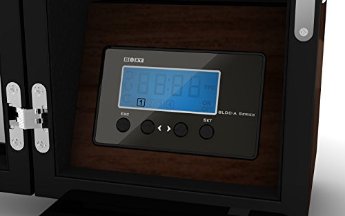 ? High gloss finish and glass display. ? External color with walnut (Dark wood decor) internal with black velvet. ? LCD control panel with back-light. ? Built-in LED lights up by touching the case. ? Concealed hinge to make the wooden housing looks neat and perfect. ? Powered by input AC100-240V / output DC 5V Adapter.