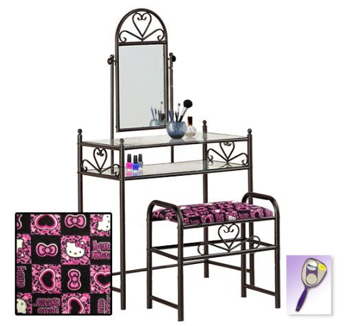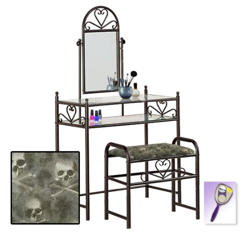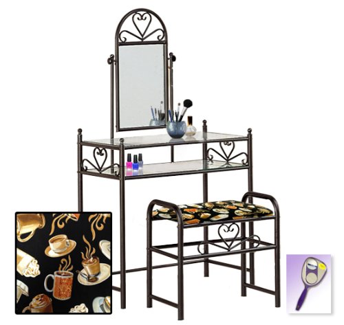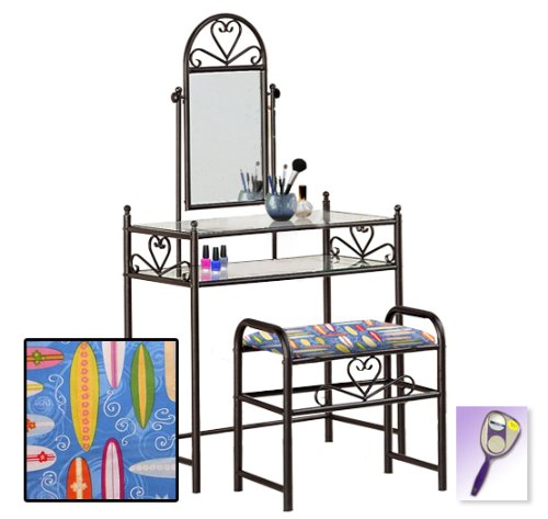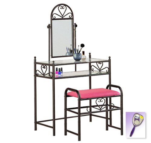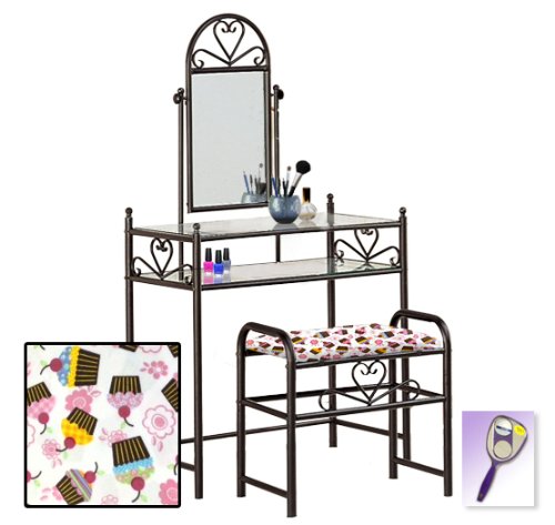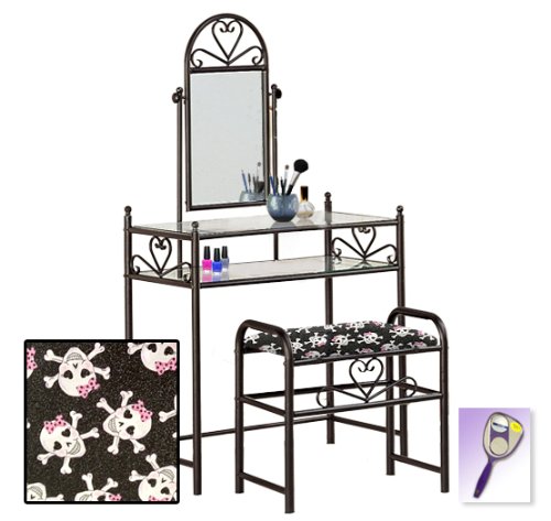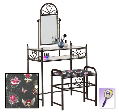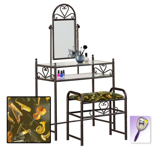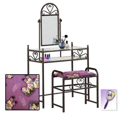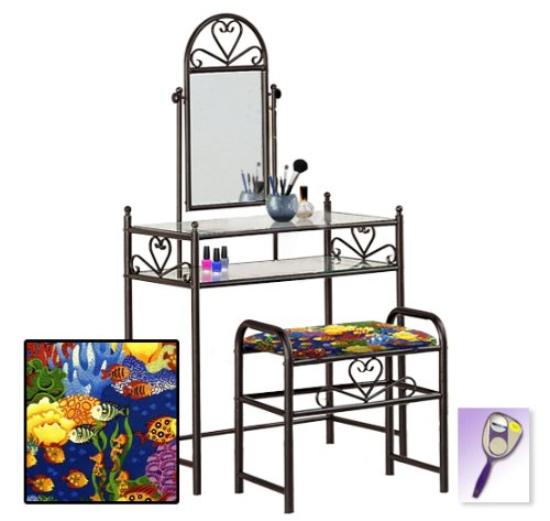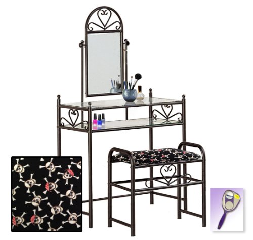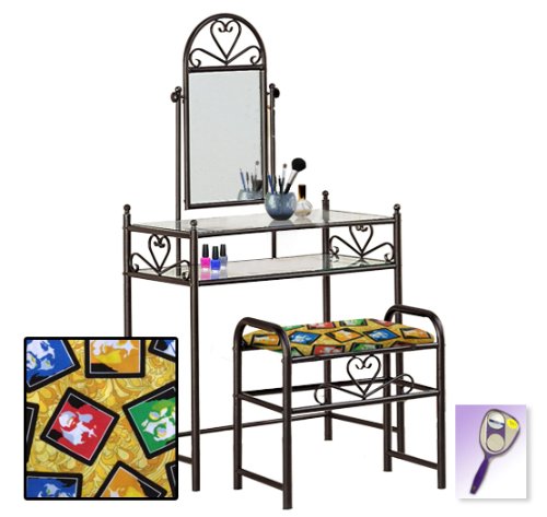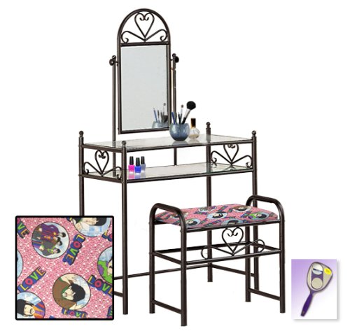 Be sure to select which seat cushion theme you would like at the top of the listing! This listing includes the vanity & custom theme seat cushion and also includes a free hand and purse mirror! Size, shape and color of mirrors may vary. This listing is for the dainty black finish make up vanity table with mirror and the seat cushion bench with the theme of your choice! The mirror is able to be adjusted and the vanity table also features 2 glass shelves! This vanity is made well and will last. Isn't it elegant? Your little one will feel like a princess with this set! The seat cushion bench with theme of your choice is included with the vanity. Vanity - 30 1/2" Wide x 15" Deep x 55" Tall (to top of mirror) Bench - 21" x 12.5" x 20" TallFeature