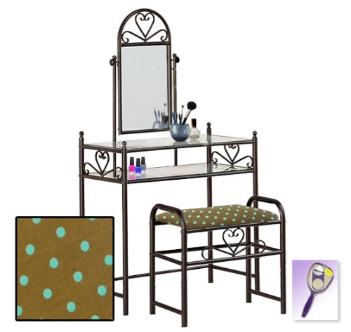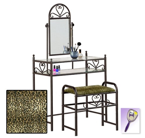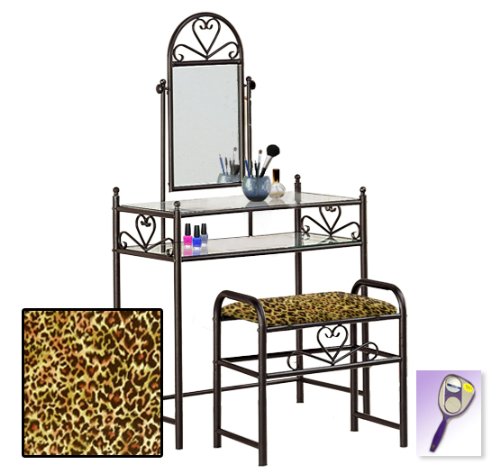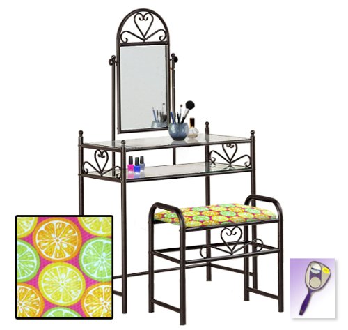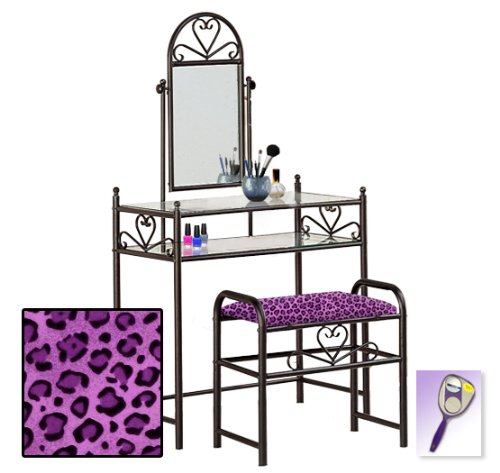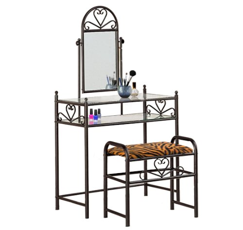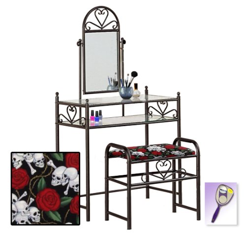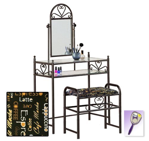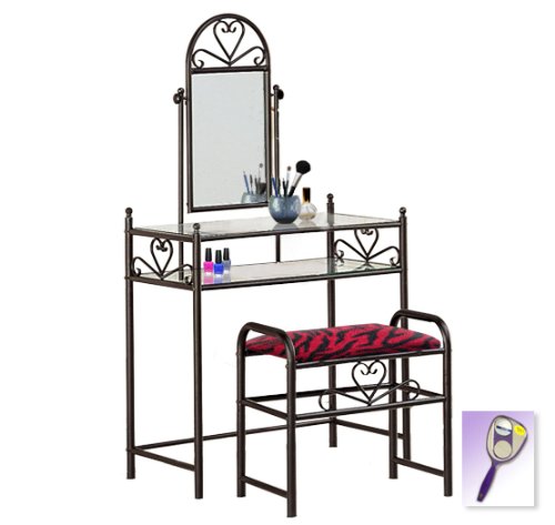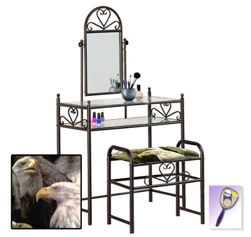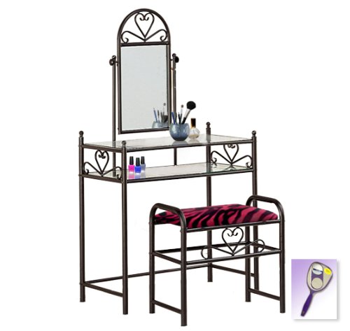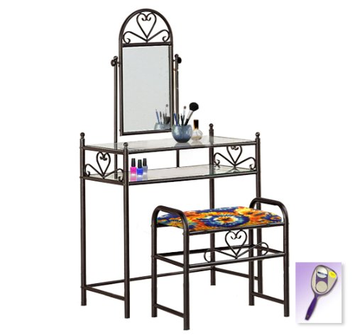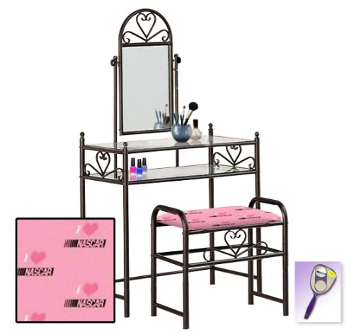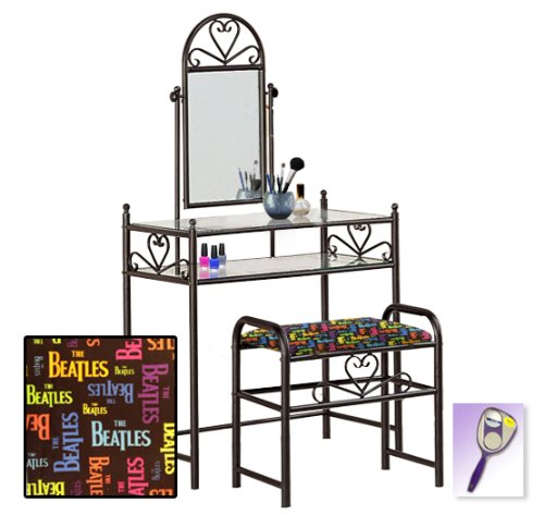 Be sure to select which seat cushion theme you would like at the top of the listing! This listing includes the vanity & custom theme seat cushion and also includes a free hand and purse mirror! Size, shape and color of mirrors may vary. This listing is for the dainty black finish make up vanity table with mirror and the seat cushion bench with the theme of your choice! The mirror is able to be adjusted and the vanity table also features 2 glass shelves! This vanity is made well and will last. Isn't it elegant? Your little one will feel like a princess with this set! The seat cushion bench with theme of your choice is included with the vanity. Vanity - 30 1/2" Wide x 15" Deep x 55" Tall (to top of mirror) Bench - 21" x 12.5" x 20" TallFeature
