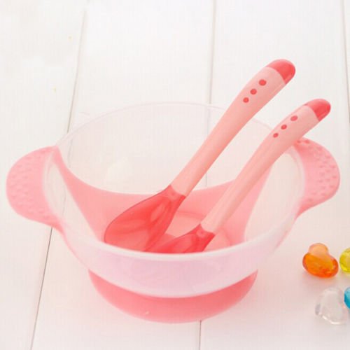 -. Title : She-love Baby Feeding Soft Silicone Suction Cup Bowl Set Slip-resistant Tableware Temperature Sensing Color Changing Flatware Baby Training Spoon Fork