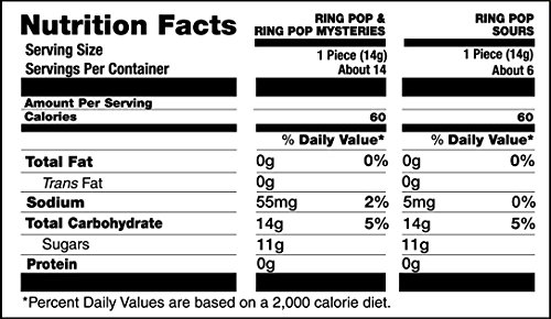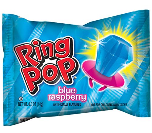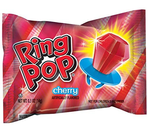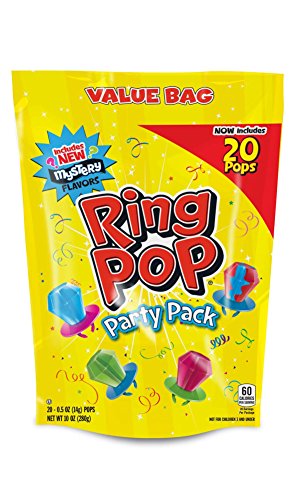 -. Feature : Topps Bazooka Ring Pop Gusseted Bag, 20 count, 10 Ounce Bag / Jewel shaped candy on top of a plastic ring. Each individually wrapped / Wrapped in a P.R.Inted sealed bag with UPC for resale / Great for parties, Picnic's, Concession Stands or for just a fun treat / Flavors -Sour Watermelon/ Sour Cherry Berry, Blue Raspberry, Strawberry, Cherry, Blue/ Pink Mystery