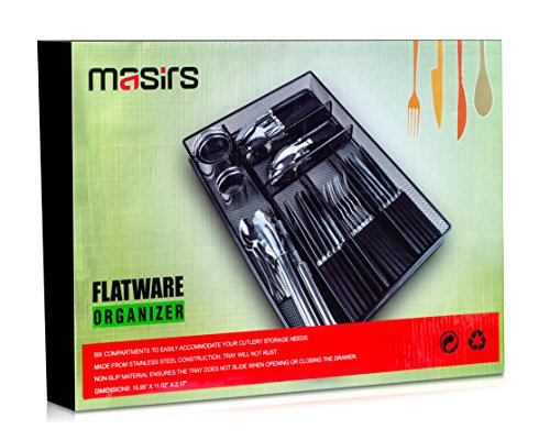 Flatware Drawer Organizer - Slip Resistant Kitchen Tray with 6 Sections to Neatly Arrange Cutlery and Serving Utensils. Also Great to Keep your Desk Drawer and Office Supplies Well Organized (Black)