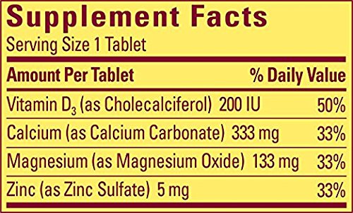Trust your bone health with Nature Made Calcium, Magnesium and Zinc. Adequate calcium in a healthy diet plays an integral role in promoting bone health and may help prevent osteoporosis later in life. Nature Made Calcium, Magnesium and Zinc is scientifically formulated to support optimal bone health. Each tablet of Nature Made Calcium, Magnesium & Zinc provides 333 mg of Calcium, 133 mg of Magnesium, and 5 mg of Zinc. Nature Made also includes 200 I.U. of vitamin D an essential nutrient for calcium absorption.Feature