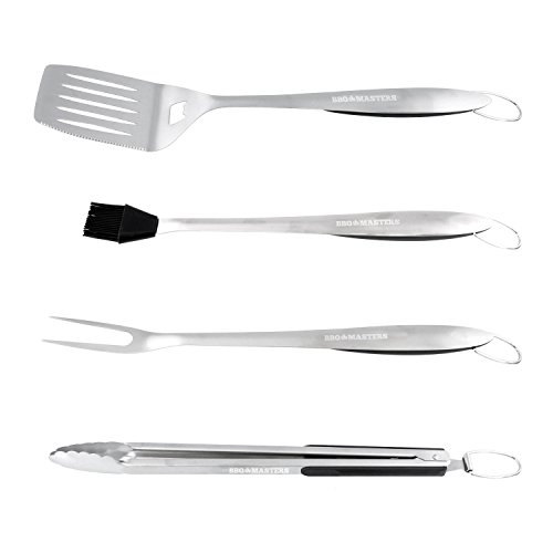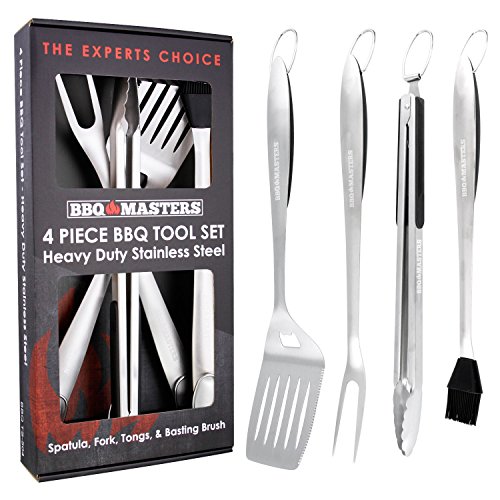 Bbq masters heavy duty 4 piece bbq grilling tools set - extra thick stainless steel barbecue grill accessories - 18" spatula, tongs, fork and basting brush utensils