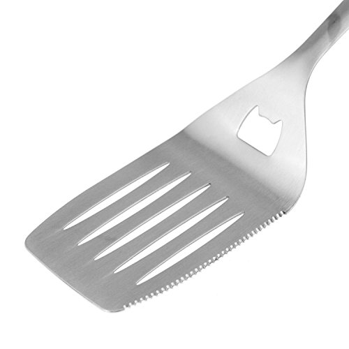 THE BEST TOOLS FOR EVERY TASK: Grilling should be fast, easy and enjoyable! Our spatula with built-in bottle opener will allow you to enjoy a cold beer or two while tailgating or for chillin when grillin at a backyard party. The spatula has a sharp steak knife serrated cutting edge. Add flavorings with the silicone basting brush! The scalloped head locking tongs make it safer and easier to grill, turn, flip & serve food on and off the BBQ. A meat fork with sharp long tines for skewering meats.