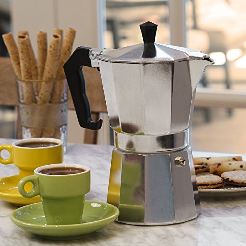 EXCEPTIONAL DESIGN: The Primula 6-Cup Aluminum Espresso Maker features a modern, stylish design with a high-quality aluminum body. The handle is made from a heat resistant plastic that not only provides you with a firm and reliable grip, but also allows your hand to stay cool during use. Its efficient layout forces pressurized water through coffee grounds, and deposits a rich, full bodied espresso blend into the serving chamber