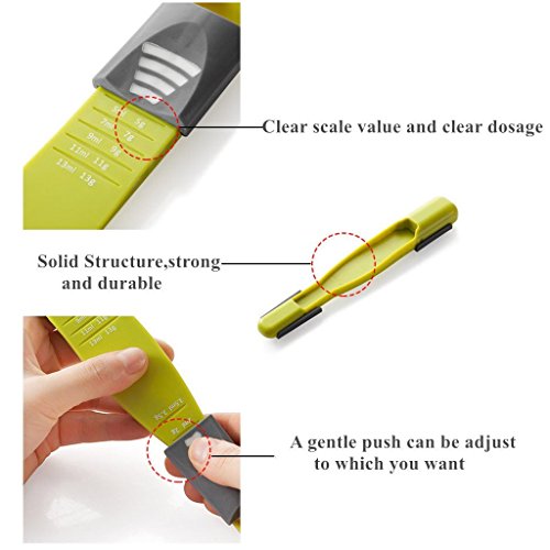 - GROOVED THUMBPRINTS DESIGN:Help you move the sliders back and forth for accurate measuring. This measuring spoon can adjust to be a 1ml - 13ml measuring spoon