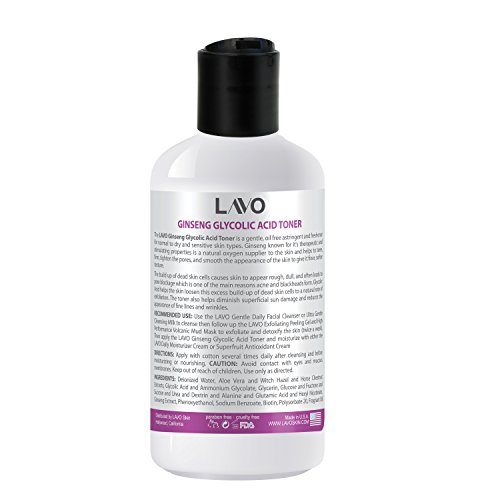 The LAVO Ginseng Glycolic Acid Toner is a gentle, oil free astringent and freshener for normal to dry and sensitive skin types. Ginseng known for it's therapeutic and stimulating properties is a natural oxygen supplier to the skin and helps to tone, firm, tighten the pores, and smooth the appearance of the skin to give it finer, softer texture. The build up of dead skin cells causes skin to appear rough, dull, and often leads to pore blockage which is one of the main reasons acne and blackheads form. Glycolic Acid and Ammonium Glycolate (5%) help the skin loosen this excess build-up of dead skin cells to a natural rate of exfoliation. The toner also helps diminish superficial sun damage and reduces the appearance of fine lines and wrinkles. The LAVO Ginseng Glycolic Acid Toner works best after cleansing with our Ultra Gentle Cleansing Milk or our Gentle Daily Facial Cleanser. Apply the toner and follow up with our Exfoliating Peeling Gel for exfoliation and High Performance Volcanic Mud Mask (3-5 minutes) to detoxify the skin (twice a week). Finally apply an appropriate moisturizer such as our Daily Moisturizer Cream or our nutrient rich Superfruit Antioxidant Cream. Use the LAVO Gentle Daily Facial Cleanser or Ultra Gentle Cleansing Milk to cleanse then follow up the LAVO Exfoliating Peeling Gel and High Performance Volcanic Mud Mask to exfoliate and detoxify the skin. Then apply the LAVO Ginseng Glycolic Acid Toner and moisturize with either the LAVO Daily Moisturizer Cream or Superfruit Antioxidant CreamFeature