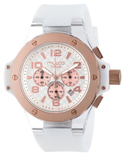 -. Feature : Rose gold-tone watch in stainless steel with checkerboard dial, exposed screws on bezel, and white silicone band / Swiss quartz movement with analog display / Protective mineral crystal dial window / Features chronograph subdial, date window, and buckle closure / Water resistant to 330 feet (100 M): suitable for snorkeling, as well as swimming, but not diving